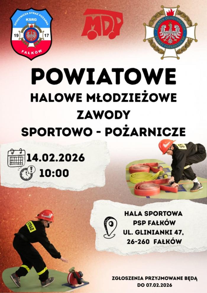 14 lutego 2026 roku o godzinie 10, w sali gimnastycznej Szkoły Podstawowej w Fałkowie rozpoczną się powiatowe zawody sportowo-pożarnicze Młodzieżowych Drużyn Pożarniczych. Akces zgłosiły drużyny: Czermno - chłopcy, Fałków - dziewczęta i chłopcy, Kazanów - chłopcy, Modliszewice - chłopcy i Niekłań - chłopcy.