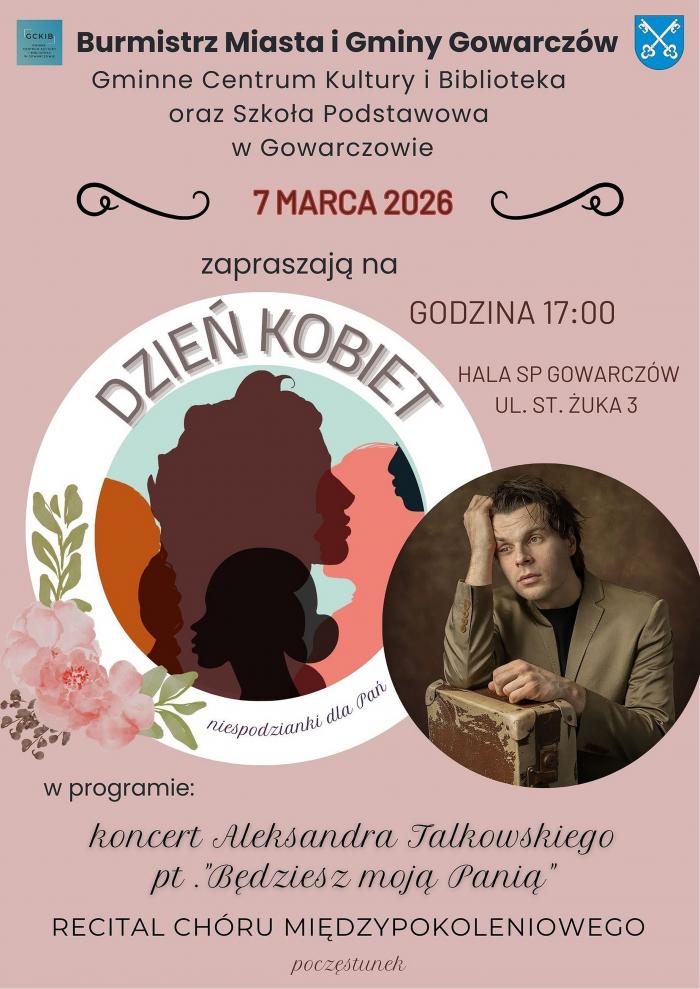 Burmistrz Miasta i Gminy Gowarczów, Gminne Centrum Kultury i Biblioteka w Gowarczowie oraz Szkoła Podstawowa w Gowarczowie serdecznie zapraszają wszystkie Panie na uroczyste obchody Dnia Kobiet!