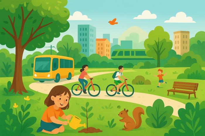 Wyobraź sobie miasto, w którym na każdym rogu rośnie drzewo, a między domami szumi las. Zamiast głośnych samochodów po ulicach jeżdżą kolorowe autobusy na prąd i rowery. Wszędzie czuć zapach świeżego powietrza i kwiatów, a ptaki śpiewają nawet w samym centrum miasta.