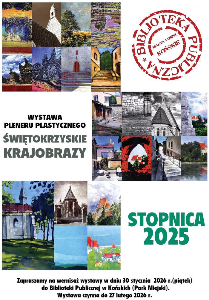 W dniach 30 stycznia - 27 lutego 2026 r. Biblioteka Publiczna Miasta i Gminy Końskie im. Cezarego Chlebowskiego oraz Polskie Stowarzyszenie Edukacji Plastycznej w Kielcach zapraszają na wernisaż wystawy pleneru plastycznego Świętokrzyskie Krajobrazy.