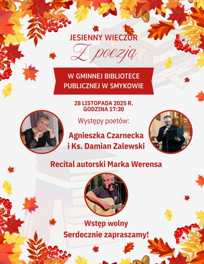 W najbliższy piątek, 28 listopada w Gminnej Bibliotece Publicznej w Smykowie odbędzie się Jesienny Wieczór z Poezją.