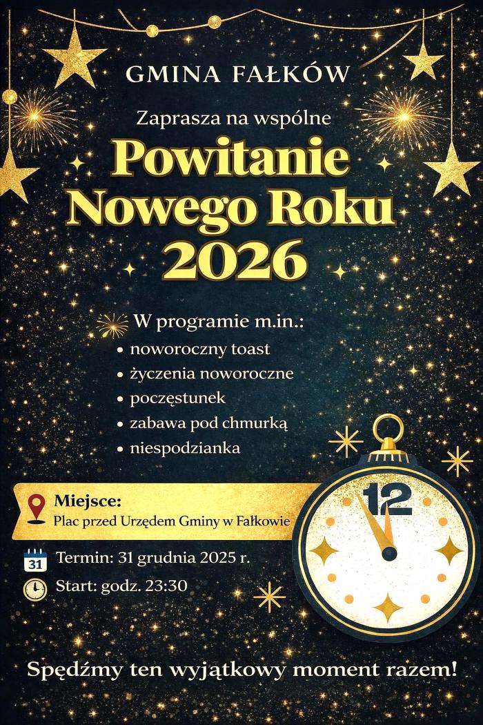 - Spędźmy ten wyjątkowy moment razem! Miejsce: Plac przed Urzędem Gminy w Fałkowie. Termin: 31 grudnia 2025 r. Start: godz. 23.30 - zapraszają urzędnicy z Fałkowa.