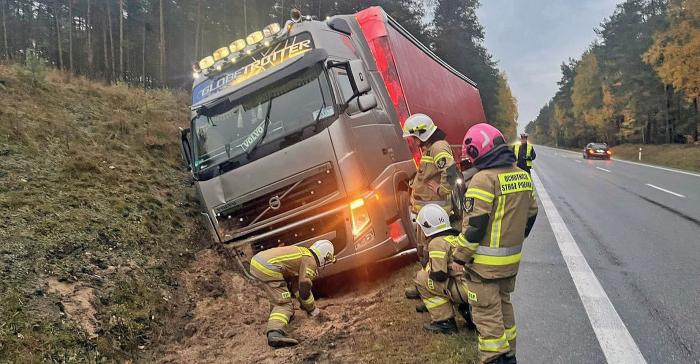 Na drodze krajowej DK74 w pobliżu Koliszów (gmina Ruda Maleniecka), w ciężarówce volvo pękła opona prawego koła. Ciągnik siodłowy z naczepą spadły do przydrożnego rowu. Nikomu nic się nie stało.