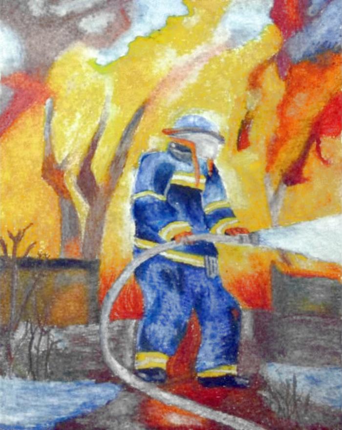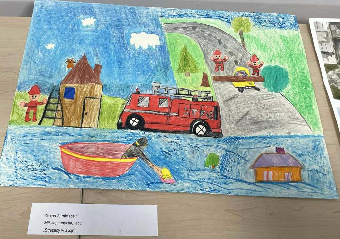 Prace podkreślające działania strażaków i druhów strażaków uczniowie wykonali różnymi technikami plastycznymi jak choćby farbami, ołówkiem, wydzieranką, haftem czy kolażem.