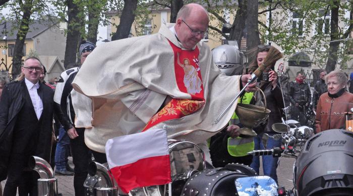Po mszy świętej ks. Jacek Wieczorek zajął miejsce w trajce koneckiej Czarnej Floty. Kierujący motocyklem powoli objechał cały teren, zajrzał do zakamarków, gdzie stały motocykle, a ksiądz kanonik święcił maszyny wodą święconą. Rzęsiście.
