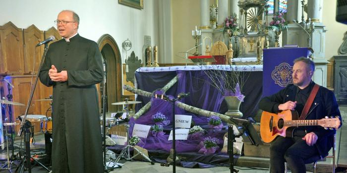 Przed koncertem ksiądz proboszcz Jacek Wieczorek, miłośnik wszelkiej, ale dobrej muzyki i wysokiej kultury powitał parafian, a głównie parafianki bo im był dedykowany koncert, którzy tego dnia przybyli do kolegiaty na popołudniową modlitwę, w nieco innym stylu. Na podreperowanie duszy, wsłuchanie się w słowa, teksty piosenek i pieśni. Najpierw złożył paniom życzenia z okazji Dnia Kobiet i dodał sugestię o wsłuchiwaniu się w słowa, teksty oprawione muzyką wysokich lotów.
