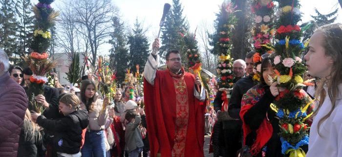Zgromadzonych powitał ksiądz kanonik Jacek Wieczorek, proboszcz parafii Tym razem w Niedzielę Palmową, momencie rozpoczynającym Wielki Tydzień, niemal wszyscy mieli palmy, palemki. Ksiądz Filip Wincewicz odczytał fragment Ewangelii i poświęcił wodą palmy i ludzi którzy wokół stali. Następnie procesja z palmami weszła do kolegiaty, by wziąć udział w mszy świętej Niedzieli Palmowej.