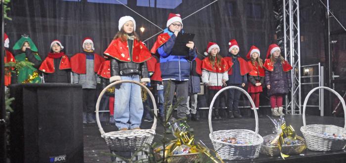 Po piosenkach, recytacjach wierszy i tańcach, jakie dzieci prezentowały na scenie, obok nich pojawił się burmistrz Końskich Krzysztof Obratański. I z uczniami odliczywszy od 10 do jednego wcisnął guzik zapalający światła na choince. Na rynku od razu zrobiło się miło i świątecznie.