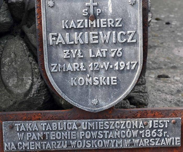 Jak podaje Alicja Skalska, w panteonie powstańców 1863 roku, utworzonym na Cmentarzu Wojskowym na Powązkach w Warszawie, umieszczona jest żeliwna tabliczka upamiętniająca weterana Kazimierza Falkiewicza. Niemal taka sama znajduje się na jego grobowcu na cmentarzu w Końskich.