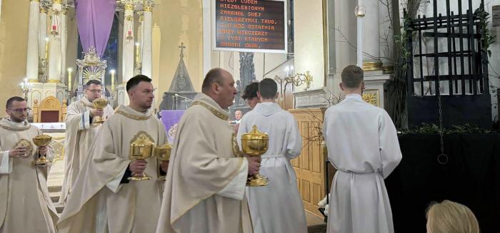 Msza Wieczerzy Pańskiej zakończyła się procesją, podczas której przeniesiono Najświętszy Sakrament do ołtarza adoracji - ciemnicy. To swego rodzaju klatka stojąca na ołtarzu św. Mikołaja, nad którą unosiła się podświetlona korona cierniowa. Uroczystości poprowadził proboszcz parafii Świętego Mikołaja w Końskich ksiądz Jacek Wieczorek.