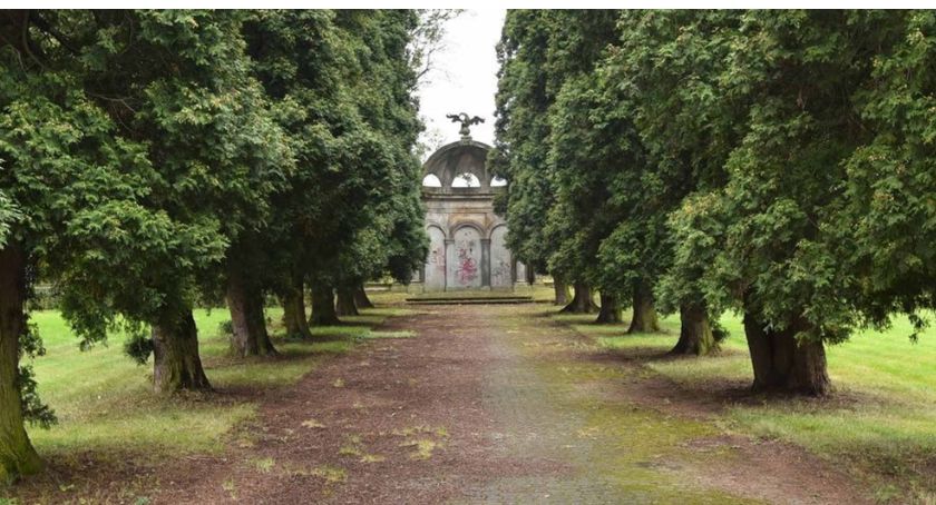 Otóż zespół pałacowo parkowy obejmował, oprócz pałacu, gdzie mieści się Urząd Miasta w Końskich ze swoimi agendami, bibliotekę, także dwa pawilony po przeciwnej stronie ul. Partyzantów ze skrawkiem zieleni i patriotycznym Ołtarzem Ojczyzny, Gloriettą.