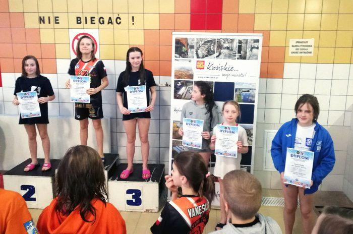 11 lat: 7. Natalia Świeboda (Wodnik) 45,54, 8. Zofia Świercz (Wodnik) 46.39... 13. Wiktoria Latańska (Wodnik) 51,08... 15. Katarzyna Cuper (Wodnik) 55,32, 16. Julia Fidor (Wodnik) 55,50, 17. Aleksandra Stęplewska (KSSiR Końskie) 59,57, 18. Katarzyna Kwapińska (KSSiR) 1.04,68, 19. Diana Domaradzka (KSSiR) 1.05,79