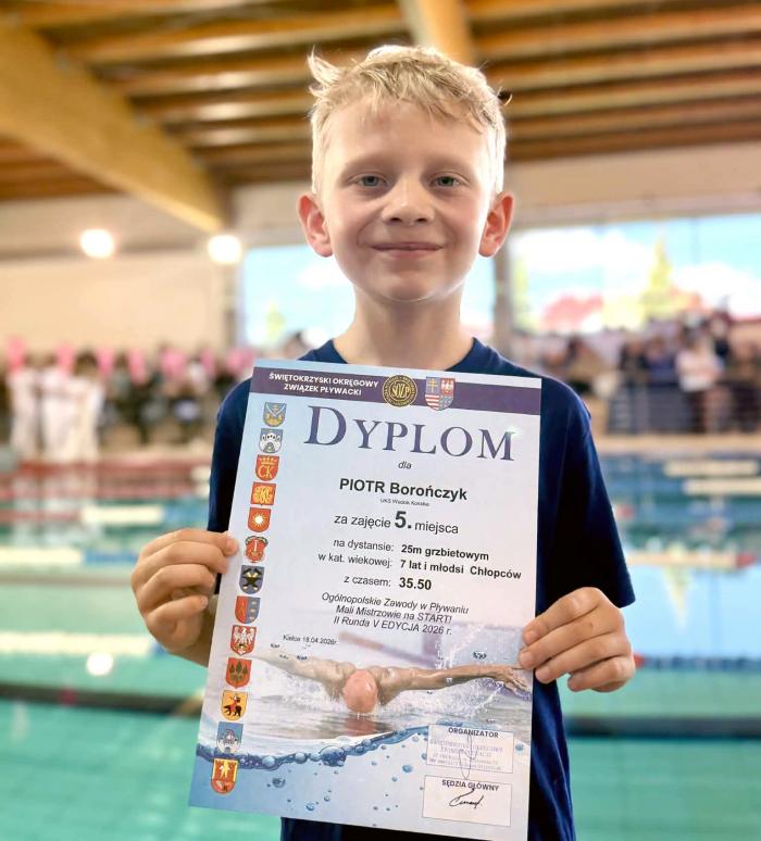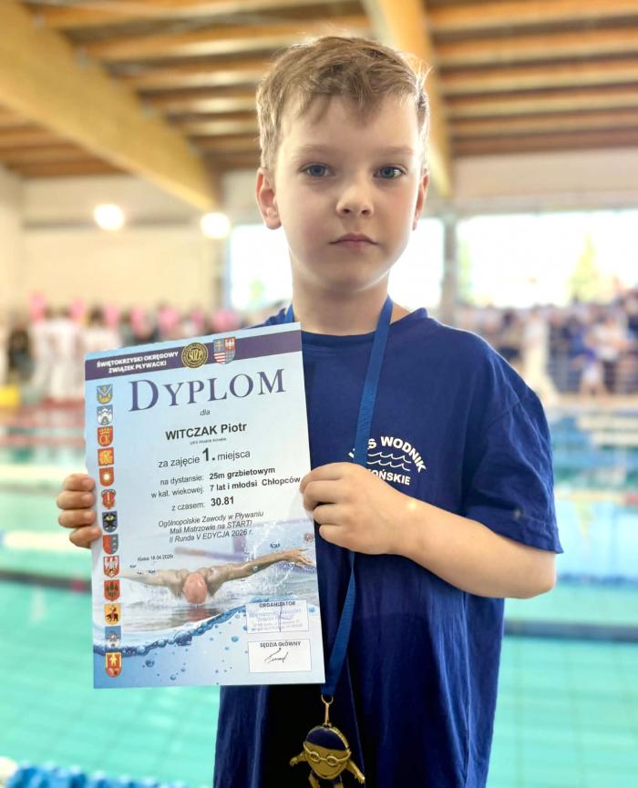 Piotr Witczak - 1 miejsce na dystansie 25 m stylem grzbietowym (7 lat i młodsi) oraz 5 miejsce na 25 m stylem dowolnym,