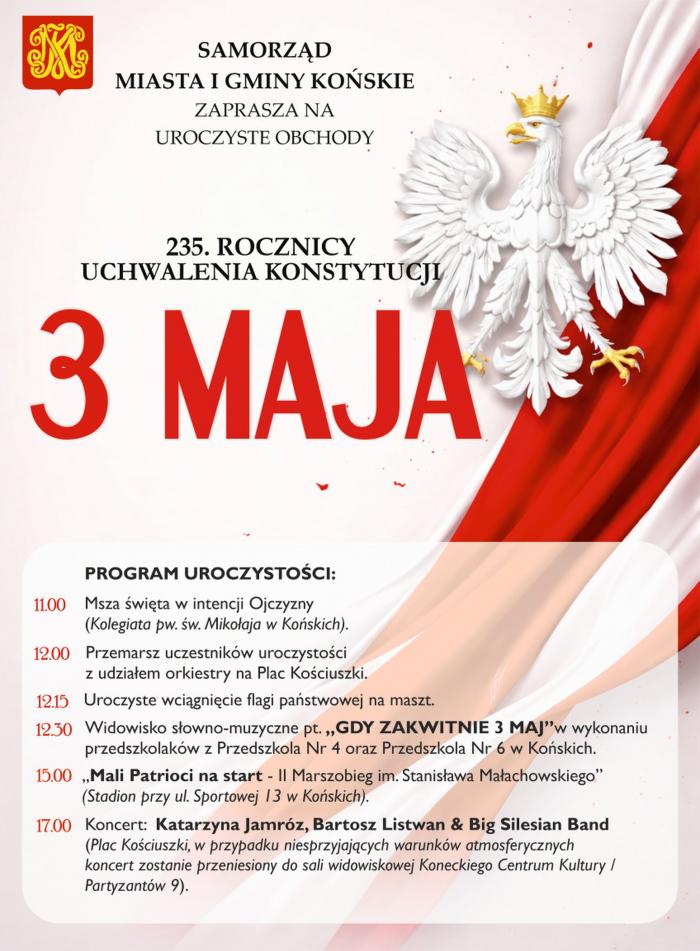 Samorząd Miasta i Gminy Końskie zaprasza na uroczyste obchody 235. rocznicy uchwalenia Konstytucji 3 Maja.