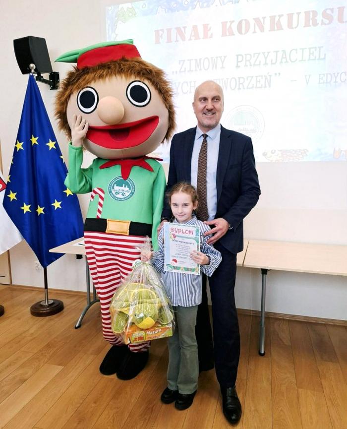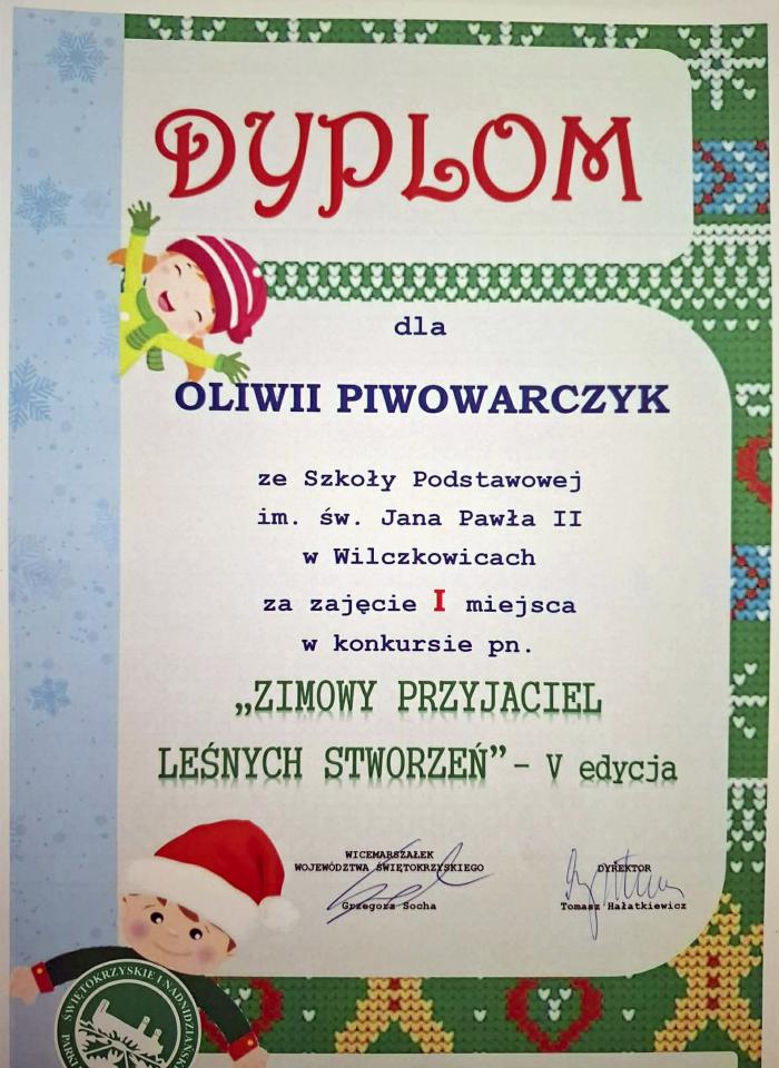 Oliwia Piwowarczyk ze Szkoły Podstawowej w Wilczkowicach została laureatką pierwszego miejsca w konkursie plastycznym pt. „Zimowy przyjaciel leśnych stworzeń”.