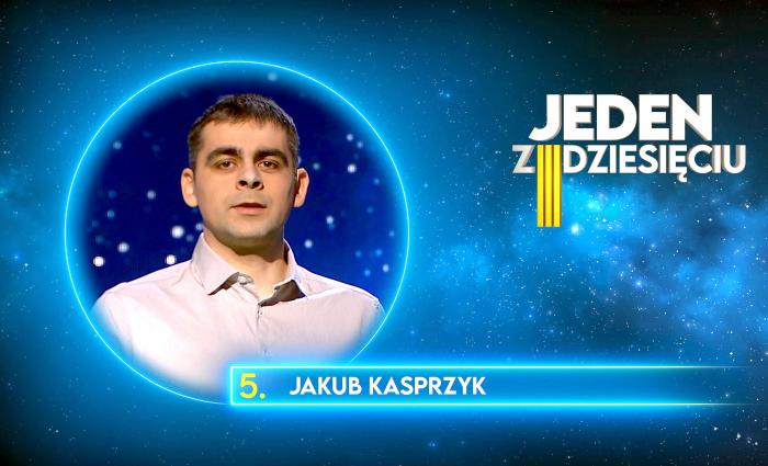 - Na co dzień pracuję przy budowie śmigłowców. Moje hobby to piłka nożna, podróżowanie z moją żoną, spotkania z przyjaciółmi. Marzę o podróży na safari z żoną. Moja rodzina: żona Magda, rodzice, siostry z rodzinami. Wziąłem udział w „Jednym z dziesięciu”, bo od dziecka chciałem się sprawdzić w tak wymagającym teleturnieju. Największym dla mnie wyzwaniem było ponowne wzięcie udziału w teleturnieju, mimo niepowodzenia w poprzednim - mówi o sobie Jakub Kasprzyk, zwycięzca pierwszego odcinka 154. edycji teleturnieju „Jeden z dziesięciu”.