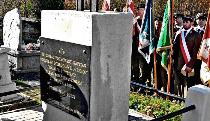 "Tu został pochowany kapitan Stanisław Dobrogojski »Grzmot«, bohater powstania, poległ pod Stefankowem 21 kwietnia 1863 roku. Pokój Jego duszy."