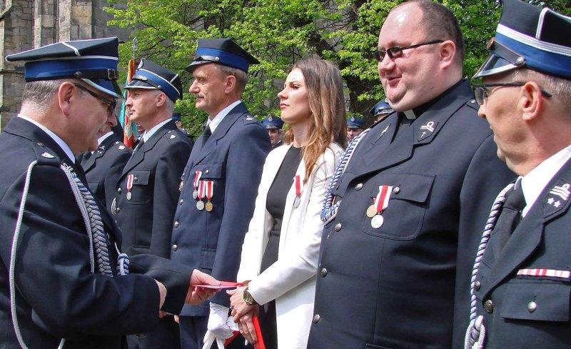 Po zakończeniu modlitwy na tym samym placu przed polowym ołtarzem odbywała się dalsza część uroczystości. Burmistrz Krzysztof Obratański a od kilku miesięcy prezes Zarządu Gminnego ZOSP przypomniał o koneckich strażakach, wielkich społecznikach. W naszej gminie jest 455 druhów strażaków, w tym 28 strażaczek i 177 druhów , którzy uczestniczą w akcjach. Działa pięć sekcji Młodzieżowych Drużyn Pożarniczych, które zrzeszają 55 młodych ludzi - 16 dziewcząt i 39 chłopców. Najstarszą jednostką strażacką w gminie i naszym powiecie jest OSP Końskie, liczy 116 lat. Jak wiadomo, jednostki OSP utrzymuje gmina. W 2015 roku samorząd zabezpieczył 290 000 złotych, na 2016 rok 324 000 zł. Prezes Obratański dziękował członkom rodzin strażackich, bo to dzięki nim dalej funkcjonują gospodarstwa domowe, gdy strażacy realizują swoje społeczne działania. Zasłużeni dla służby pożarniczej druhny i druhowie zostali odznaczeni medalami. Wręczali je dh Andrzej Bętkowski, dh Krzysztof Obratański, dh Andrzej Lenart,dh Krzysztof Jasiński, dh Jerzy Rąbalski, st.bryg.Grzegorz Młynarczyk. Słowa podziękowania za pracę, współpracę i życzenia przekazali strażakom m.in.: podinsp. Tomasz Jarosz, st.bryg.Grzegorz Młynarczyk, dh Andrzej Bentkowski.