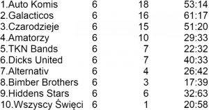 Czarodzieje, Galacticos i Auto Komis Daniel Zych, solidarnie, w podobnych rozmiarach, wygrały swoje mecze. - Najciekawszy jednak pojedynek stworzyli ligowi outsiderzy: Hiddens Stars i Wszyscy Święci. Mimo świetnej gry MVP kolejki Kacpra Bednarza, Wszyscy Święci przegrali. I okopali się na ostatnim miejscu w tabeli - relacjonuje Marcin Michalczyk.