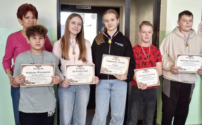 Kl. IV-VIII: 1. Wiktor Wrzeszcz (kl. IV) - mistrz szkoły, 2. Iga Konieczna (kl. VII), 3. Magdalena Nowak (kl. VIII), 4. Antoni Ostrowski (kl. V), 5. Mikołaj Sobczyk (kl. VI).