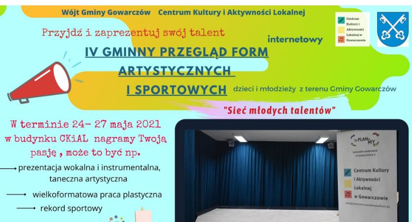 Wójt gminy Gowarczów zaprasza dzieci i młodzież z terenu gminy Gowarczów do udziału w „IV Gminnym Przeglądzie Form Artystycznych i Sportowych”.