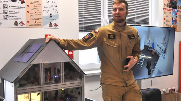 Sercem sali są dwa interaktywne symulatory, sterowane z poziomu tabletu i wyposażone w system kamer HD: symulator zagrożeń (Dom): Pozwala na pokazanie symulacji pożaru oleju na patelni, sadzy w kominie, zapalenia się ładującego telefonu czy paneli fotowoltaicznych. Prezentuje również nowoczesne rozwiązania ekologiczne, jak pompy ciepła i rekuperację.