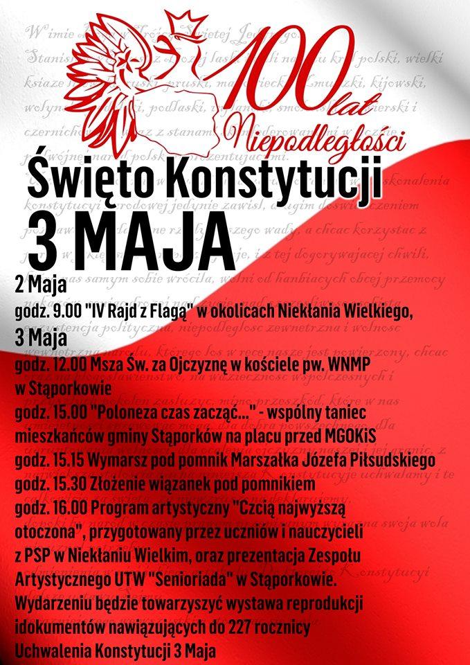 Uroczystości rozpoczną się o godz. 11.30 w stąporkowskim kościele od występu uczniów z PSP nr 2 w Stąporkowie. Po patriotycznym programie rozpocznie się msza święta w intencji ojczyzny. Tak jak w minionych latach druga część odbędzie się po południu w MGOKiS. Na godz. 15 na placu przed MGOKiS rozpocznie się taneczny korowód. Do wspólnego odtańczenia poloneza zostaną zaproszeni wszyscy, zarówno artyści z MGOKiS jak i mieszkańcy gminy obecni na placu. Po polonezie tanecznym krokiem wszyscy udadzą się przed pomnik marszałka Piłsudskiego, by złożyć kwiaty. Na godz. 16 zaplanowano patriotyczny program "Czcią najwyższą otoczona" w wykonaniu uczniów ze szkoły w Niekłaniu Wielkim oraz zespołu Senioriada działającego w Uniwersytecie Trzeciego Wieku w Stąporkowie. Wydarzeniu towarzyszyć będzie wystawa reprodukcji dokumentów poświęcona 227. rocznicy uchwalenia Konstytucji 3 maja.