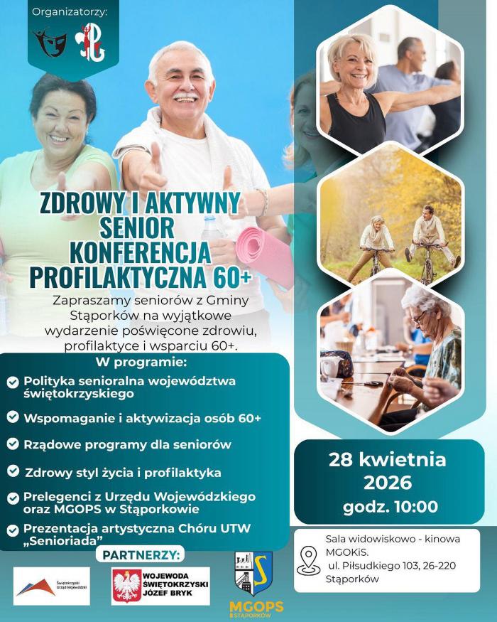 Spotkanie profilaktyczne poświęcone zdrowiu, aktywności i wsparciu osób 60+, z motem przewodnim „Zdrowy i aktywny senior”, odbędzie się 28 kwietnia w Miejsko-Gminnym Ośrodku Kultury i Sportu w Stąporkowie.