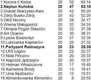 Wyniki 20 kolejki IV ligi: Neptun Końskie - Klimontowianka Klimontów 4:2, Wierna Małogoszcz - Partyzant Radoszyce 1:1, Korona II Kielce - GKS Nowiny 2:0, Unia Sędziszów - Olimpia-Pogoń Staszów 2:1, Alit Ożarów - Lubrzanka Kajetanów 0:1, ŁKS Łagów - Granat Skarżysko-Kam. 1:1, Zdrój Busko-Zdrój - Nida Pińczów 2:1, Kamienna Brody - Naprzód Jędrzejów 1:1, Łysica Bodzentyn - Hetman Włoszczowa 1:0.