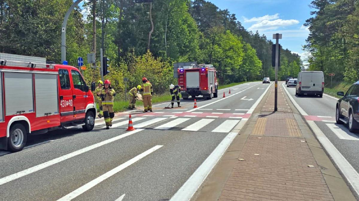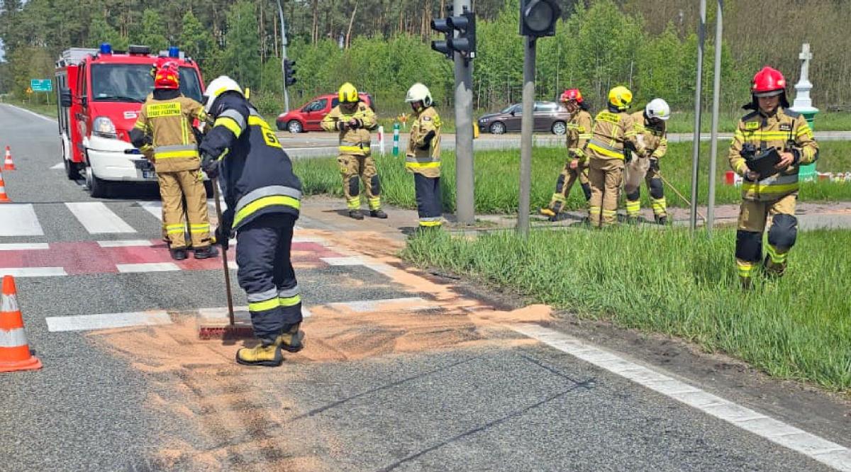 Na skrzyżowaniu drogi krajowej DK74 z wojewódzką DW728 w gminie Radoszyce doszło do kolizji volkswagena i hyundaia. Strażacy PSP uprzątali płyny pokolizyjne. Nikomu nic się nie stało. Zdjęcia przedstawiają akcję sprzątania miejsca zdarzenia przez strażaków.