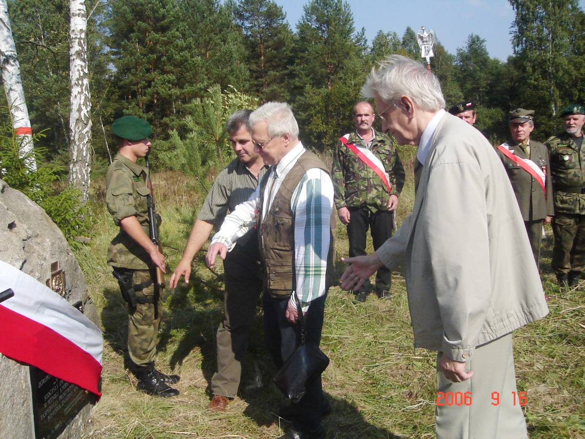 Moment odsłonięcia kamienia na Barwinku w Leśnictwie Kaczka w rocznicę bitwy z niemiecką obławą. Kamień Pamięci odsłonili "Magik" Jerzy Bartnik – najmłodszy żołnierz z oddziału "Habdanka" i dr Cezary Chlebowski pisarz , publicysta, autor "Pozdrówcie Góry Świętokrzyskie"- najgłośniejszej pozycji na temat partyzantki "Ponurego". 16.09.2006 r. Fot. Leszek Nowak
