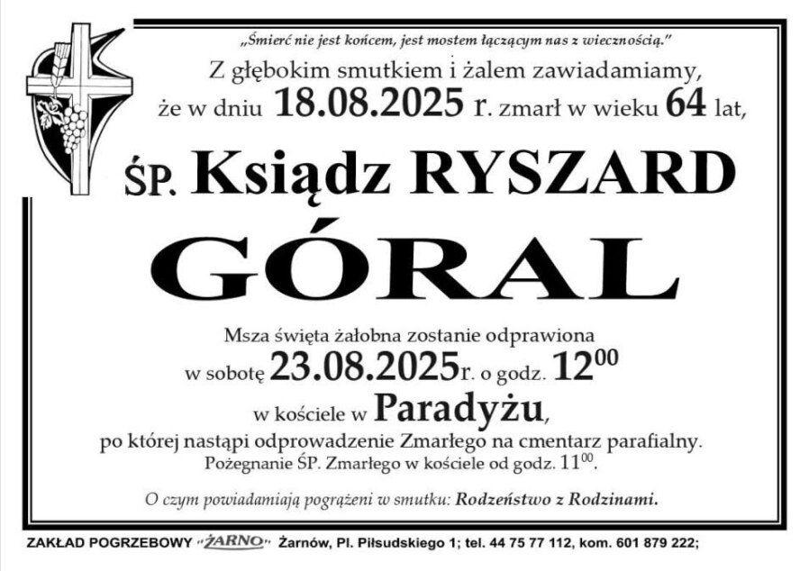 Galeria zdjęć poświęcona pamięci ks. Ryszarda Górala, zmarłego 18 sierpnia 2025 r., administratora parafii pw. Miłosierdzia Bożego w Seredzicach. Społeczność lokalna żegna kapłana, który oddawał się służbie parafianom z pasją i wiarą. Msza żałobna 22 sierpnia, a pogrzeb 23 sierpnia w parafii pw. Przemienienia Pańskiego w Wielkiej Woli - Paradyżu. Jego życie i posługa kapłańska zostaną na długo wspominane.